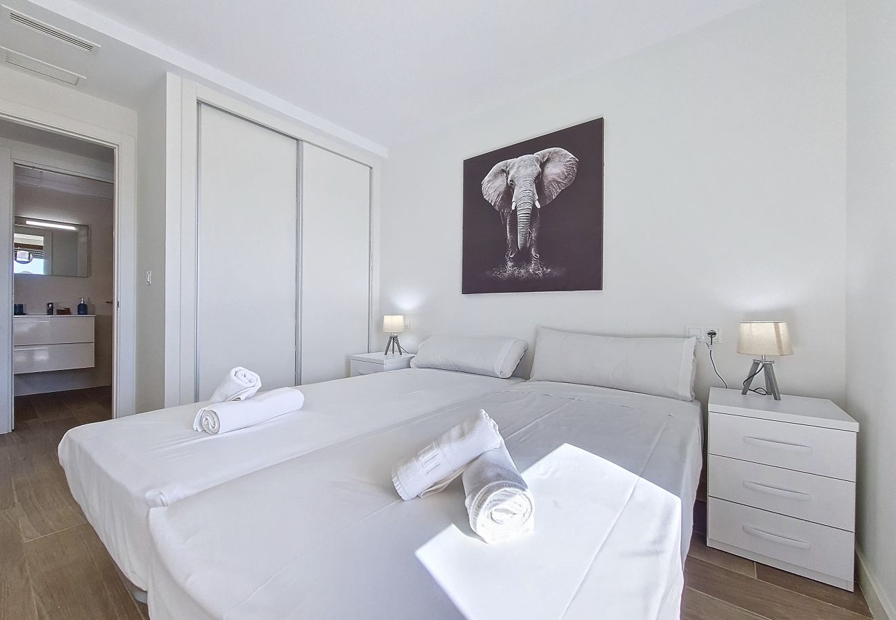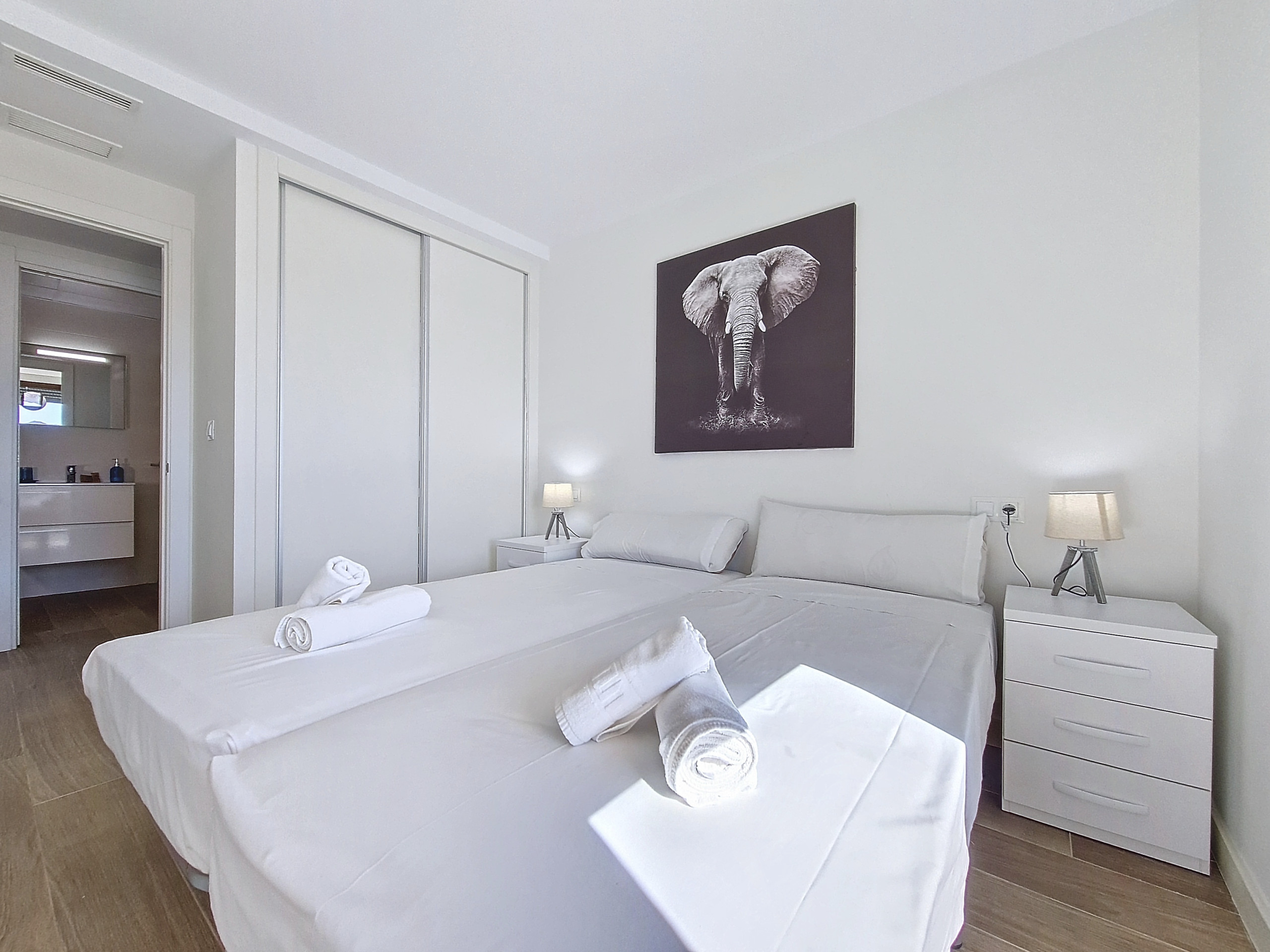 El apartamento tiene fantásticas vistas al complejo y al mar. Hay 2 dormitorios y 2 baños, sala de estar con cocina y grandes puertas que dan al balcón donde puede disfrutar de la vista, comer o relajarse en el sofá, también puede acceder al balcón desde ambos dormitorios.