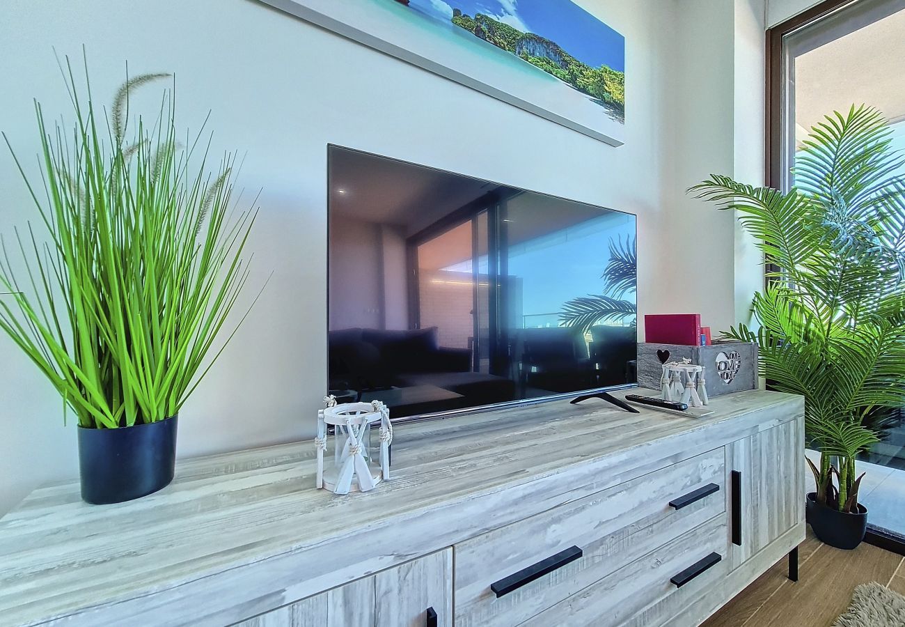 El apartamento tiene impresionantes vistas al complejo y al mar. Hay 2 dormitorios y 2 baños, una sala de estar de planta abierta con cocina y grandes puertas que dan al balcón donde podrá disfrutar de la vista, comer fuera o relajarse en el sofá.