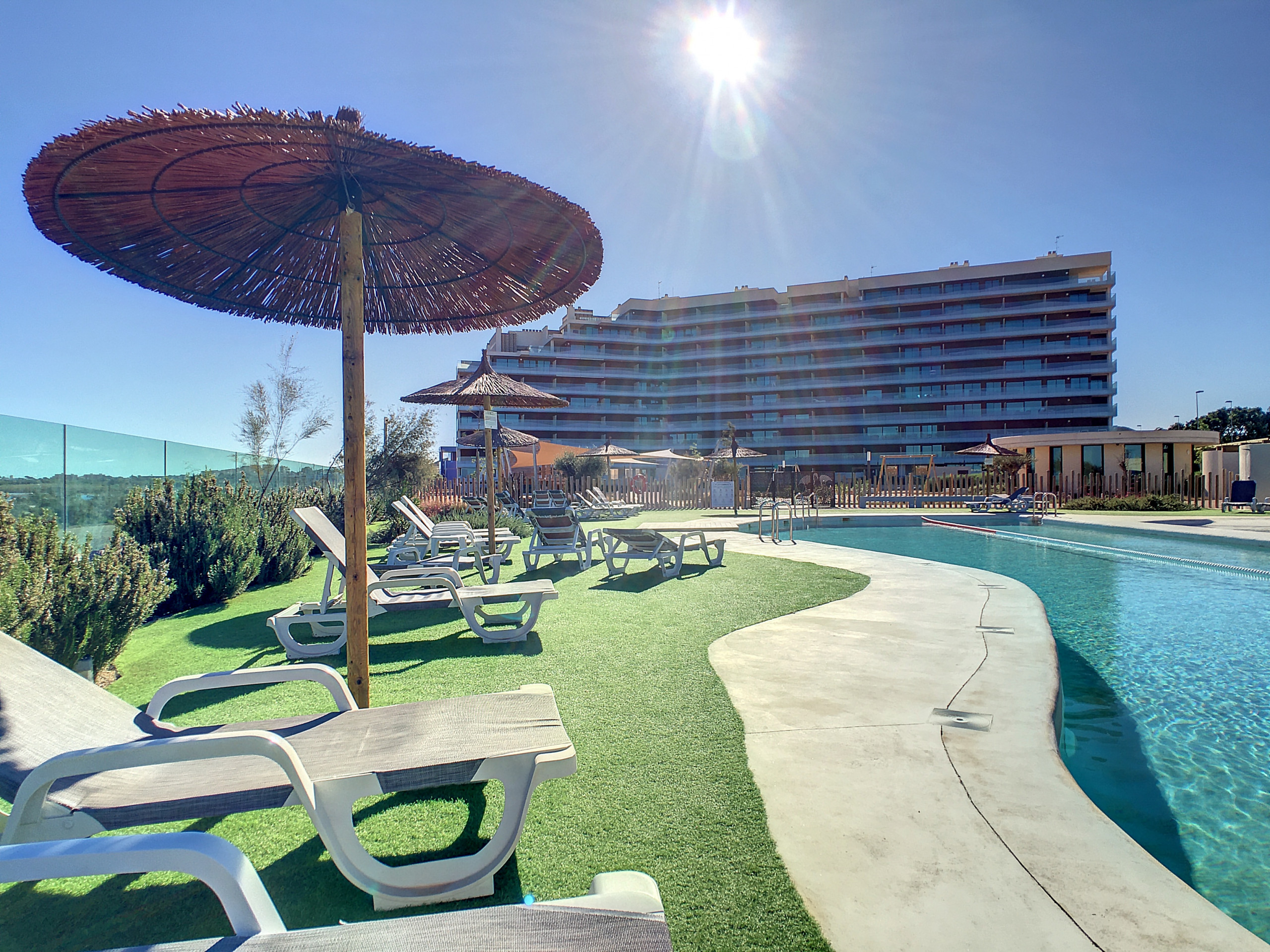 El complejo está repleto de características que incluyen, amplia zona de piscina, zona chill-out, gimnasio, zona de juegos para niños, Spa, zona deportiva que incluye voleibol y petanca, observatorio de aves, sala de juegos y jardín mediterráneo.